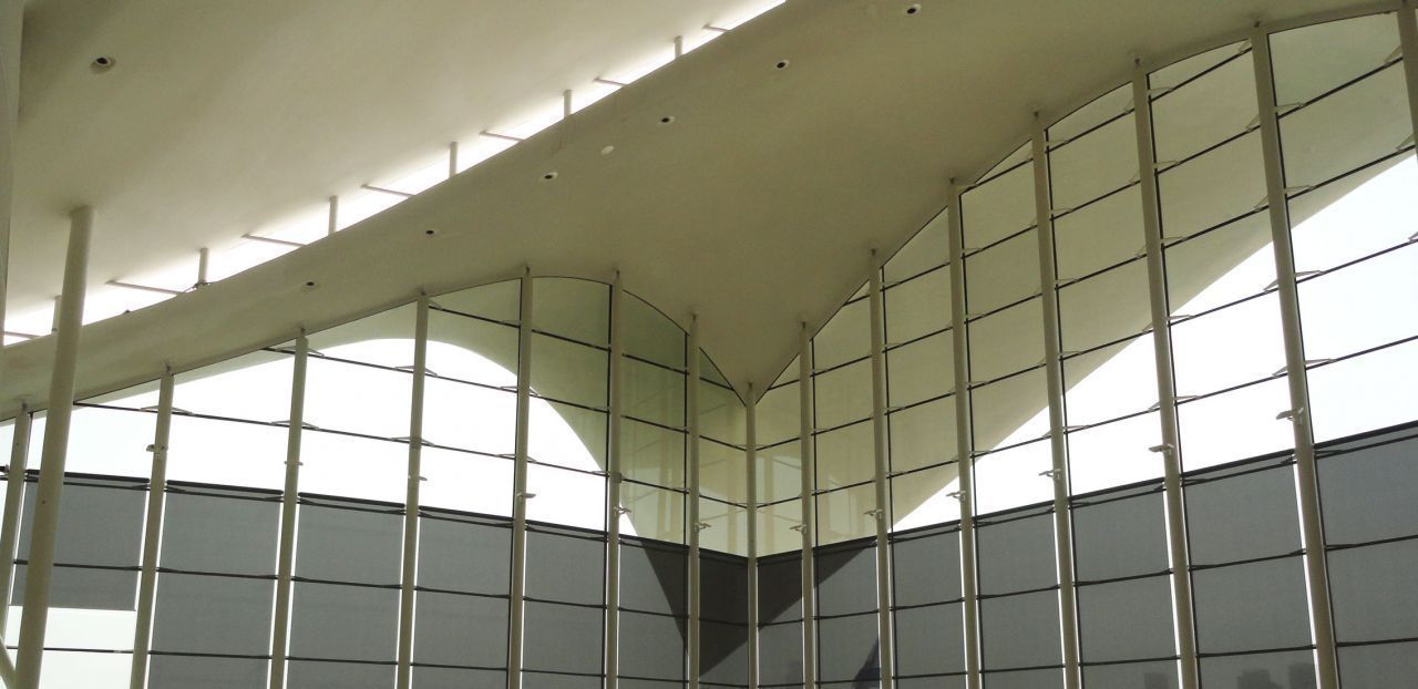 De grote zaal en de bibliotheek worden overdekt door golvende gebogen schaaldaken die schaduw creëren over de glazen gevels en diffuus licht naar binnen reflecteren.