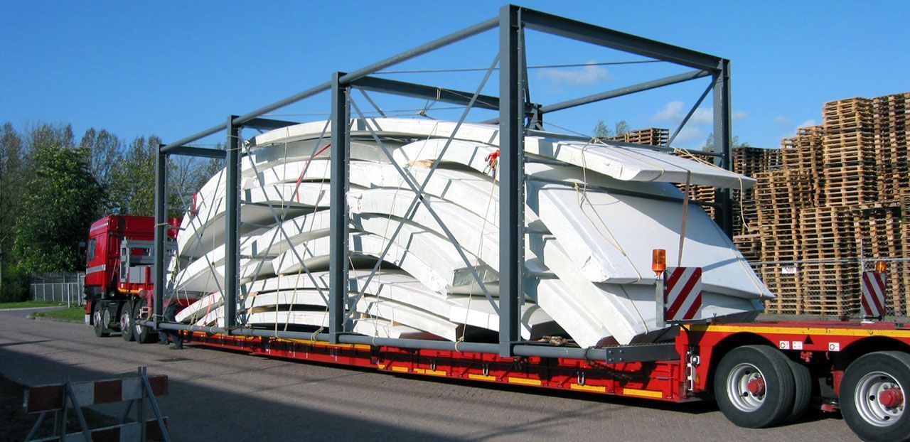 De segmenten zijn op hun kop geassembleerd en vervolgens gemeten en bevestigd door middel van de geprefabriceerde versterkte stroken. Daarna zijn ze opnieuw gemeten, afgewerkt en met een gaas en vulstof versterkt. De onderkant heeft een brandwerende laag gekregen en de bovenkant een infrarood bestendige laag. Uiteindelijk zijn de schalen omgedraaid en aan alle zijden gelijkmatig afgewerkt.