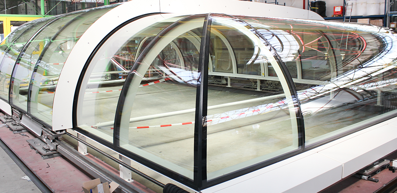 De glashoeken vormden een bijzondere uitdaging vanwege hun stijve geometrie en de toleranties in het productieproces voor warm gebogen beglazing. Om een perfecte passing te garanderen zijn de hoeken geproduceerd met een contra-mal.