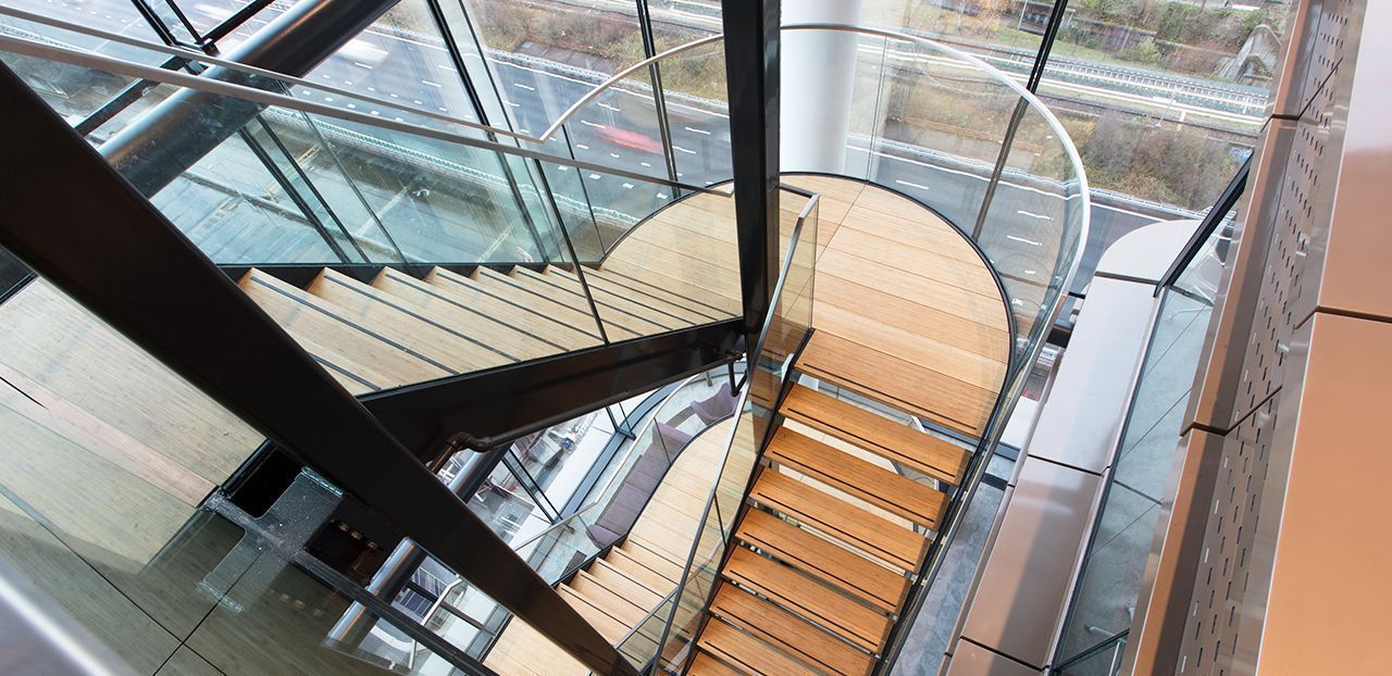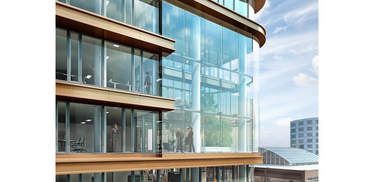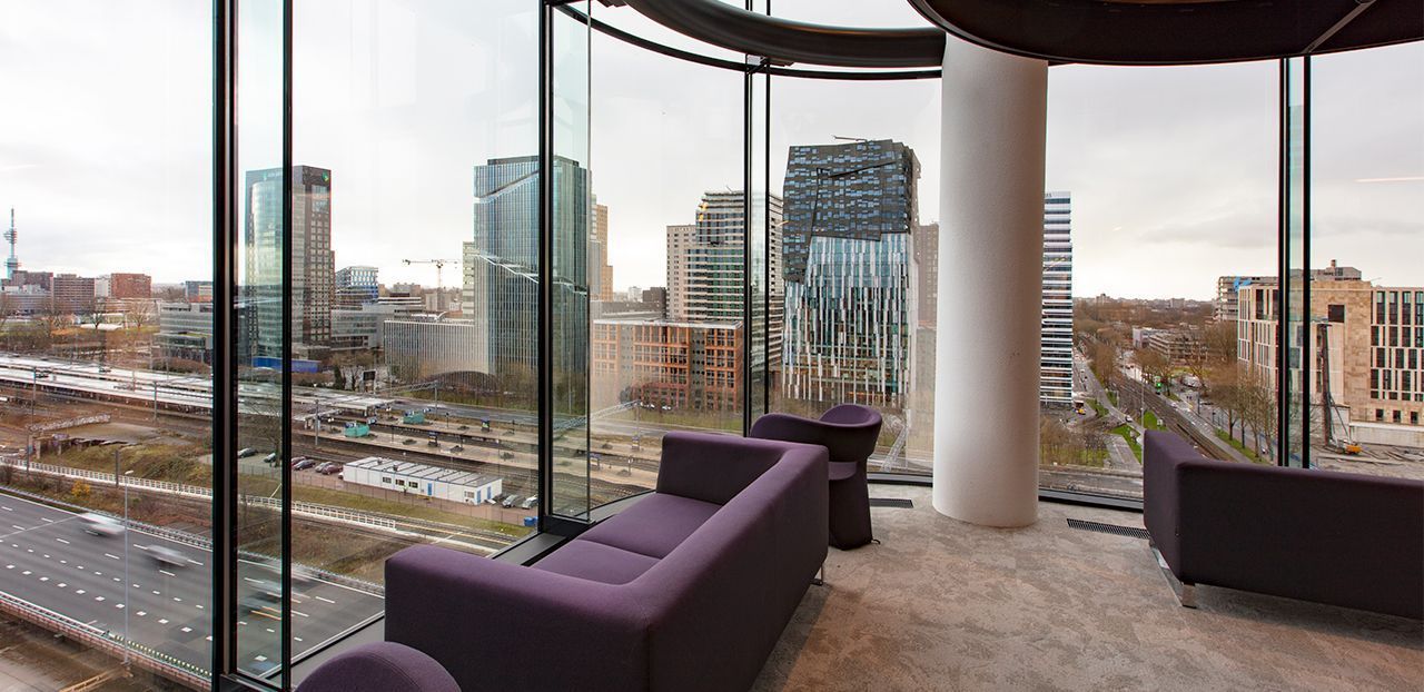 Jeroen Schilder, senior architect bij MVSA Architects in Amsterdam en projectleider van Atrium Zuidas: “Om het pand aan de nieuwste standaard te laten voldoen, moesten de nodige aanpassingen worden gedaan. Door gebruik van duurzame en robuuste materialen en op elkaar afgestemde kleuren krijgt het geheel zowel binnen als buiten een chique uitstraling. De nieuwe torens hebben prachtige binnentuinen, die op diverse hoeken over twee of drie verdiepingen zijn aangebracht. Wat echt bijzonder is, zijn de op de hoeken aangebrachte gebogen glazen raampartijen uit één stuk met een radius van 2.40 meter. Dit glas is speciaal uit Duitsland geïmporteerd en heeft alle testen met glans doorstaan.”
