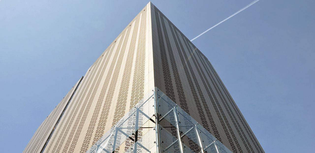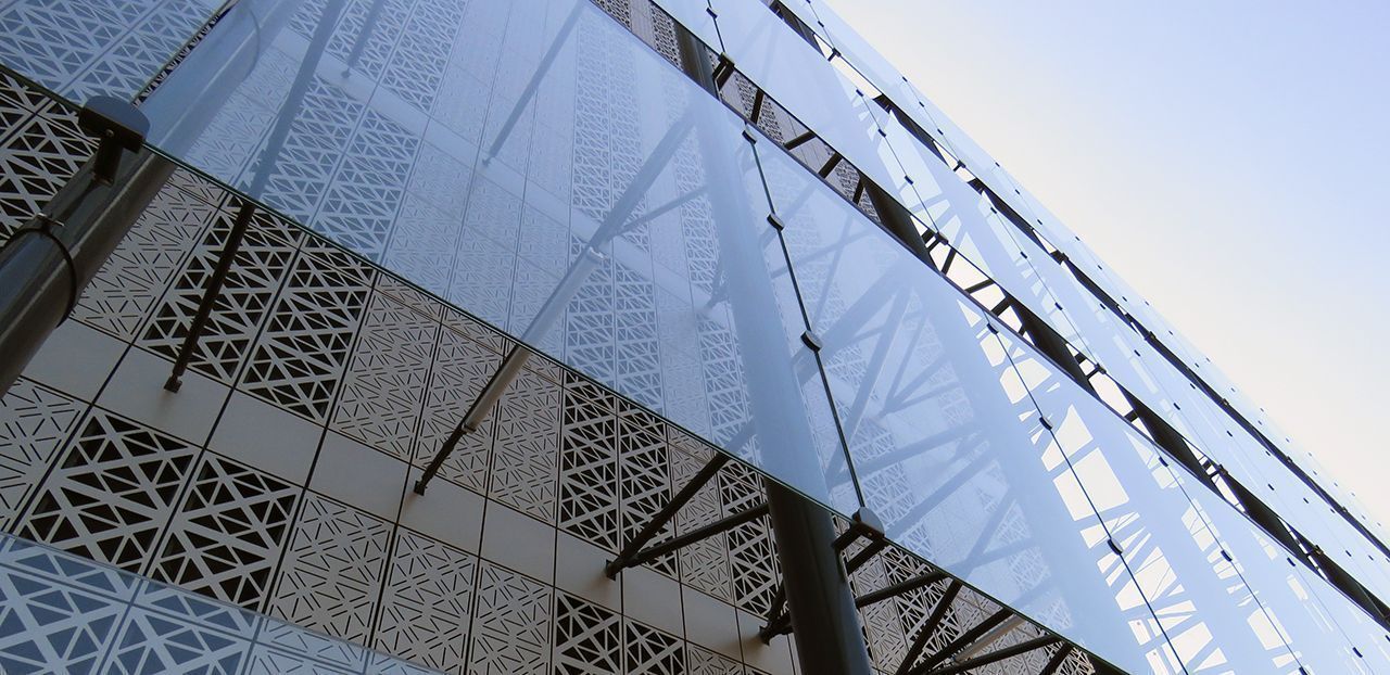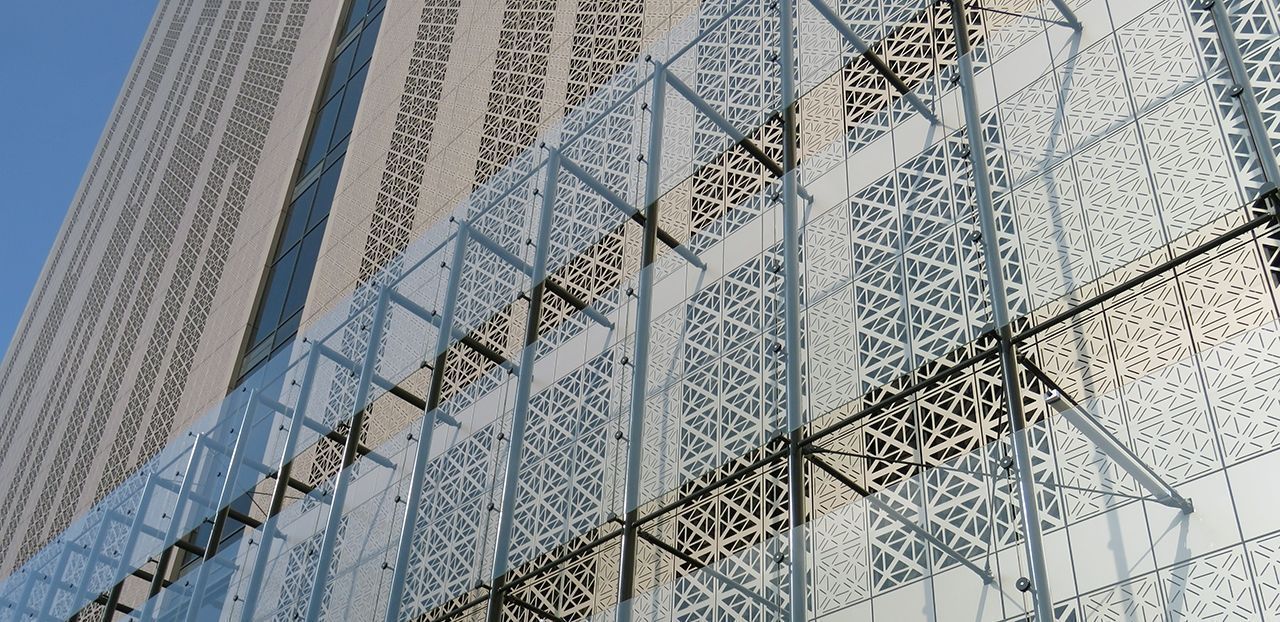 Architectonisch gezien geeft de glazen gevel het hoge gebouw een voetstuk. Daarnaast dient de glazen voorzetgevel als een entree en extra veiligheidsbarrière. De constructie ervan bestaat uit ellipsvormige stalen buisprofielen die op een afstand van tweeënhalve meter van de van aluminium platen voorziene gebouwgevel zijn geplaatst. Er is bewust gekozen om de haakvormige constructie uit te voeren in ellipsvormige buisprofielen omdat deze - naast hun voordeel in het opnemen van de horizontale windbelastingen - ook een zeer slank aanzicht hebben. De staalconstructie is voorzien van veiligheidsglas (ruim 500 panelen) dat is bevestigd door middel van speciaal ontworpen glasklemmen. Ten behoeve van de entrees bevat de glasgevel een schuifdeur, een speciale grotere schuifdeur als goedereningang en drie reguliere draaideuren.