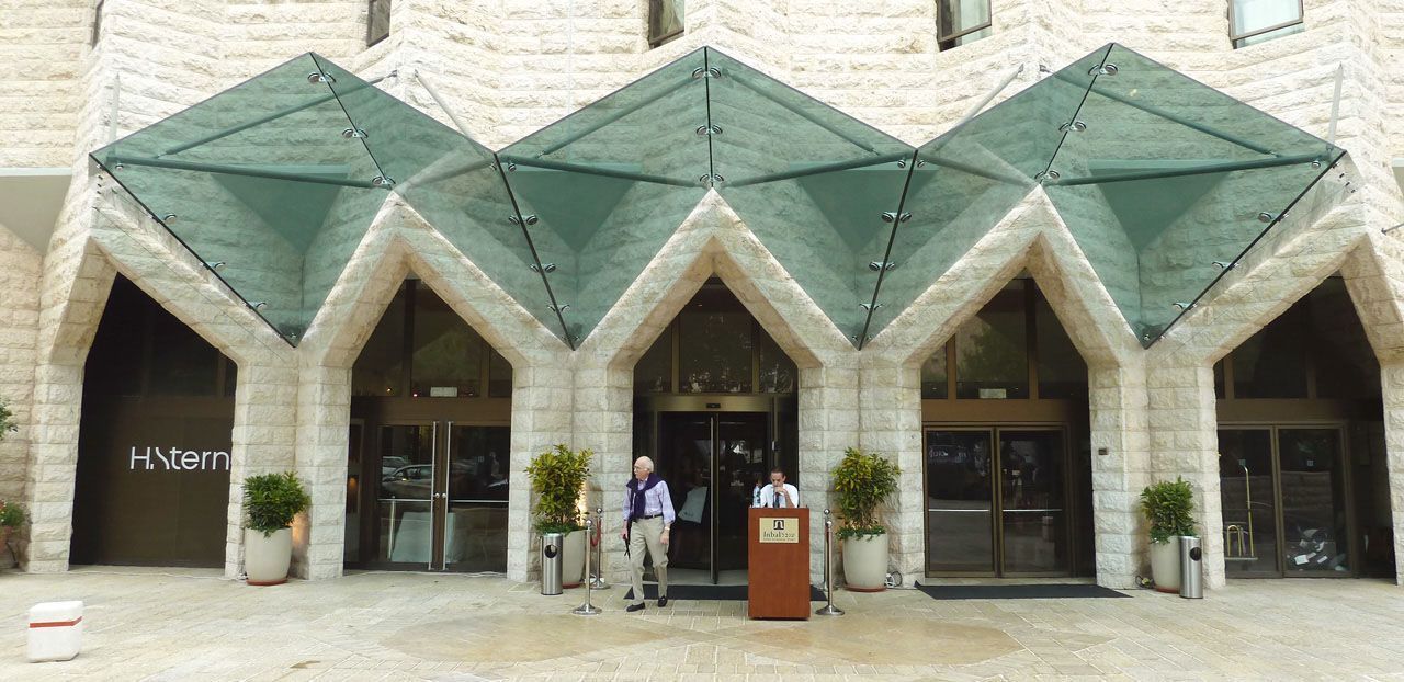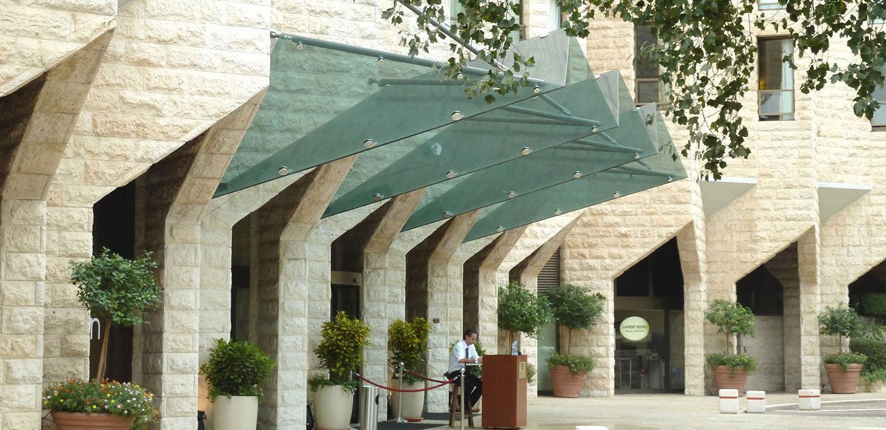 Voor de hoofdingang van het Inbal Hotel in Jerusalem (Israel) heeft Octatube een uitdagende glazen luifel gerealiseerd. De architect (Michael Schwartz) van de luifel heeft zich laten inspireren door Japanse Origami, wat heeft geresulteerd in een ontwerp dat uit gevouwen vlakken bestaat. Deze vormentaal sluit ook goed aan bij de gevels van het bestaande hotel.