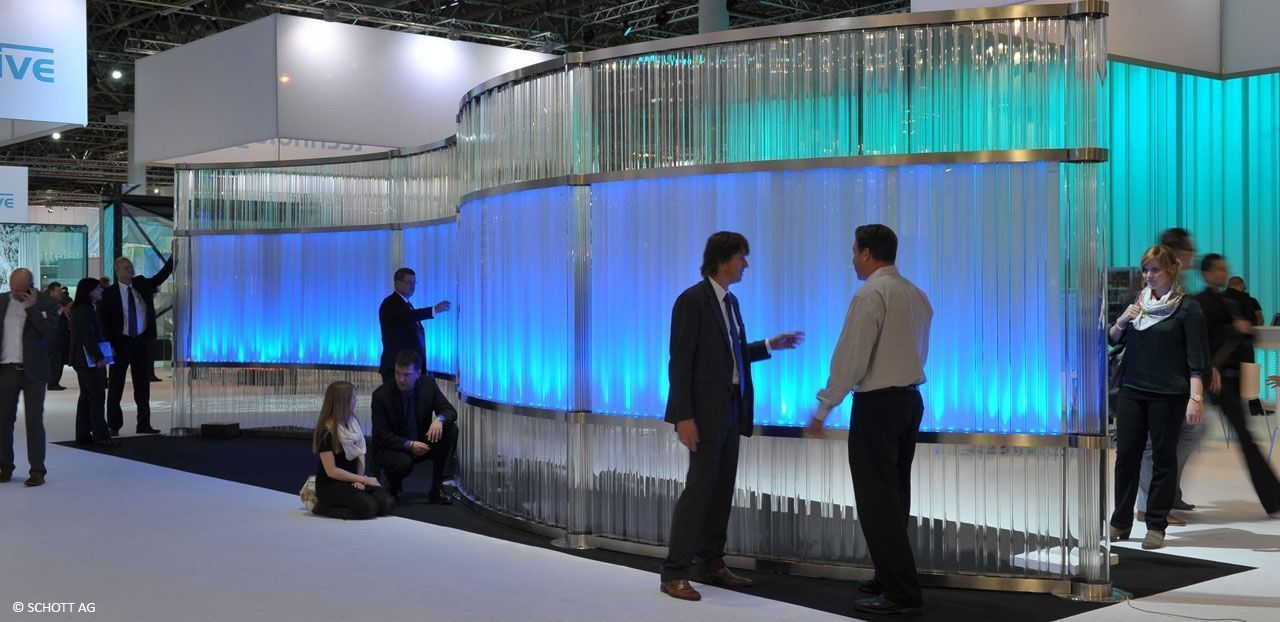 Voor de beursstand van Schott AG op de Glasstec in Düsseldorf heeft Octatube vorige maand een glazen wand gerealiseerd waarin verschillende nieuwe producten van Schott zijn verwerkt, zoals glazen buizen.