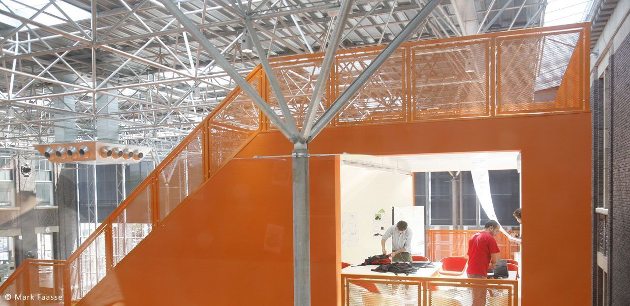 De gevels zijn gebaseerd op kassenbouw en zijn aangepast voor deze hoogte. De ruimtes worden veelvuldig en flexibel gebruikt voor onder andere het bouwen van maquettes, lezingen, studeren en evenementen.