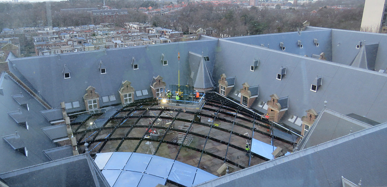 Octatube is uitgenodigd om, als onderdeel van de renovatie, één van de monumentale binnenplaatsen te overkappen met een gridshell koepeldak. Een uitdagende opgave in zowel engineering, constructie, productie als montage. Zo mogen we geen horizontale krachten loodrecht op de gevels van de binnentuin afdragen. Daarnaast zijn de verbindingen in de constructie niet momentvast, maar ook niet scharnierend. In een vroeg stadium een integrale, multidisciplinaire werkwijze introduceren stelt ons in staat deze uitdagingen aan te gaan.