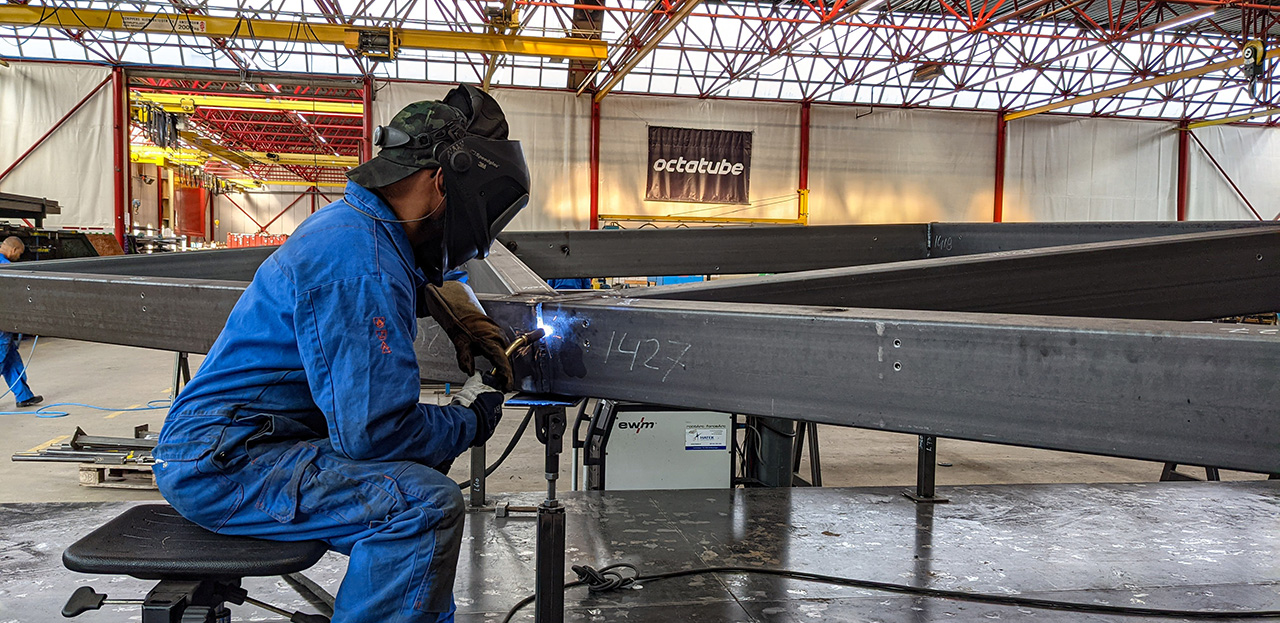 Het dak is opgebouwd uit een combinatie van gelaste ladderframes en geboute verbindingsbalken. Waar bij C30 alle onderdelen uniek waren vanwege de net niet vierkante perimeter, hebben we hier door slim te spiegelen twee dezelfde ladderframes gecombineerd één unieke in het midden. De ladderframes zijn geproduceerd in de werkplaats van Octatube. Aangezien het verbinden van de knooppunten zeer precies werk is, hebben we een 3D-lasmal ontworpen. De mal is in alle richtingen verstelbaar, zodat de stalen kokers onder precies de juiste hoek gelast konden worden. Een stalen staf fungeert als hart van de knoop, waaromheen de kokerprofielen zijn gelast.
