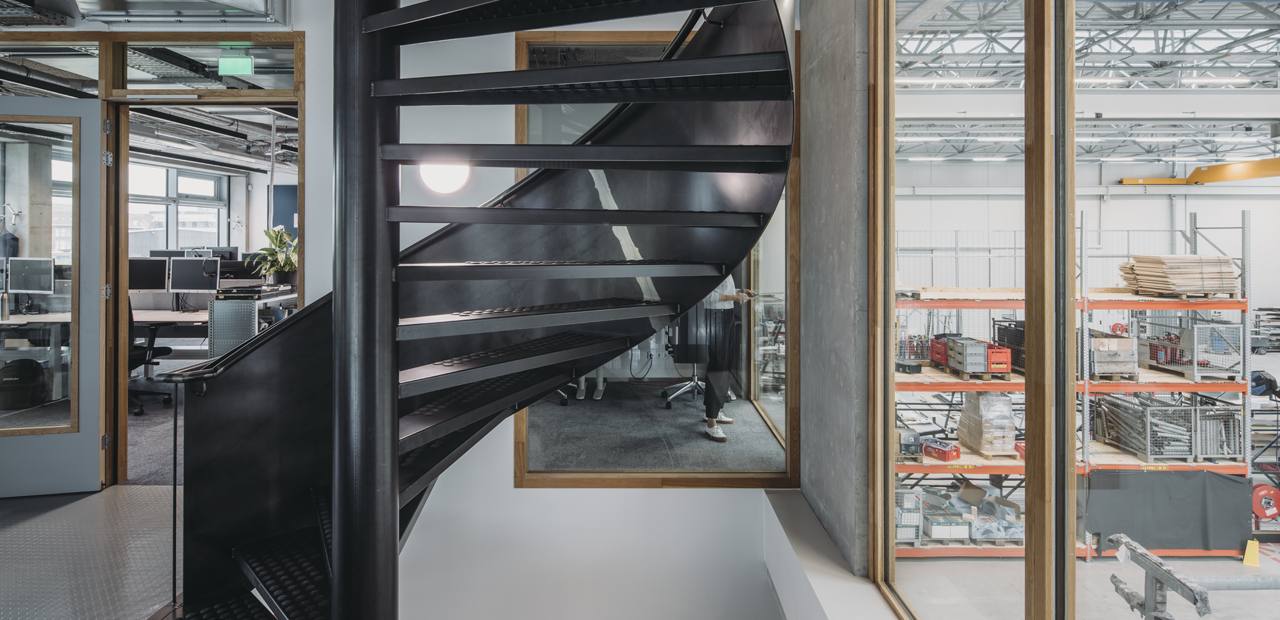 De binnenruimtes van de nieuwbouw zijn flexibel en kunnen vrij worden ingedeeld. Hierdoor kunnen we inspelen op veranderende behoeften. Dit geldt voor het kantoor, maar ook voor de productiehallen waar de binnenruimtes kunnen meebewegen, afhankelijk van de grootte van het project. Het kantoorgebouw heeft nu twee verdiepingen. Structureel (en op het gebied van warmteopwekking) is het klaar voor een derde en vierde verdieping om onze toekomstige groei op te vangen.