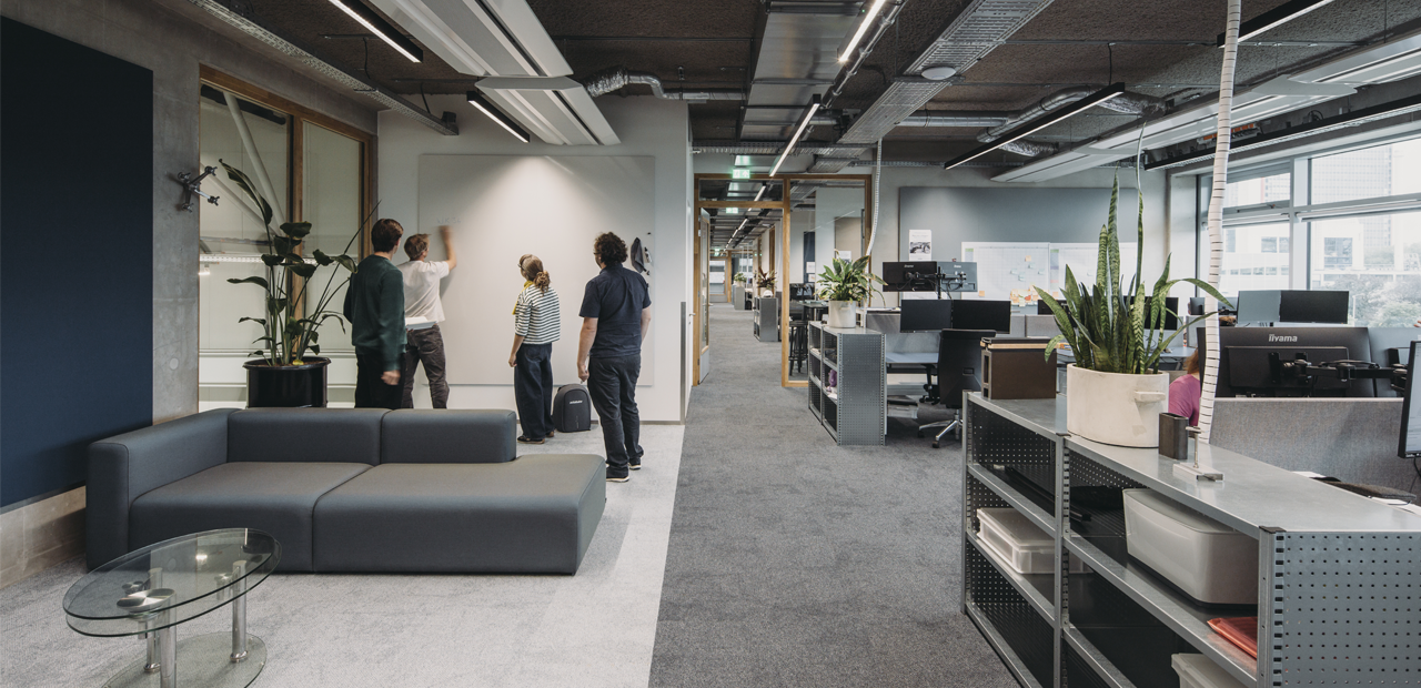 Waar het oude gebouw zijn beperkingen had, zit de nieuwbouw vol met ruimtes om elkaar in verschillende settings te ontmoeten. Vergaderruimtes, een experience hal met tribune, plekken voor stand-ups, loungeplekken, een kantine (met biertap) en een binnenkort te realiseren dakterras. Ruimtes die we gebruiken om bij te praten, te discussiëren, te leren en te verbeteren. Of gewoon om te eten, praten, ontspannen en lachen.