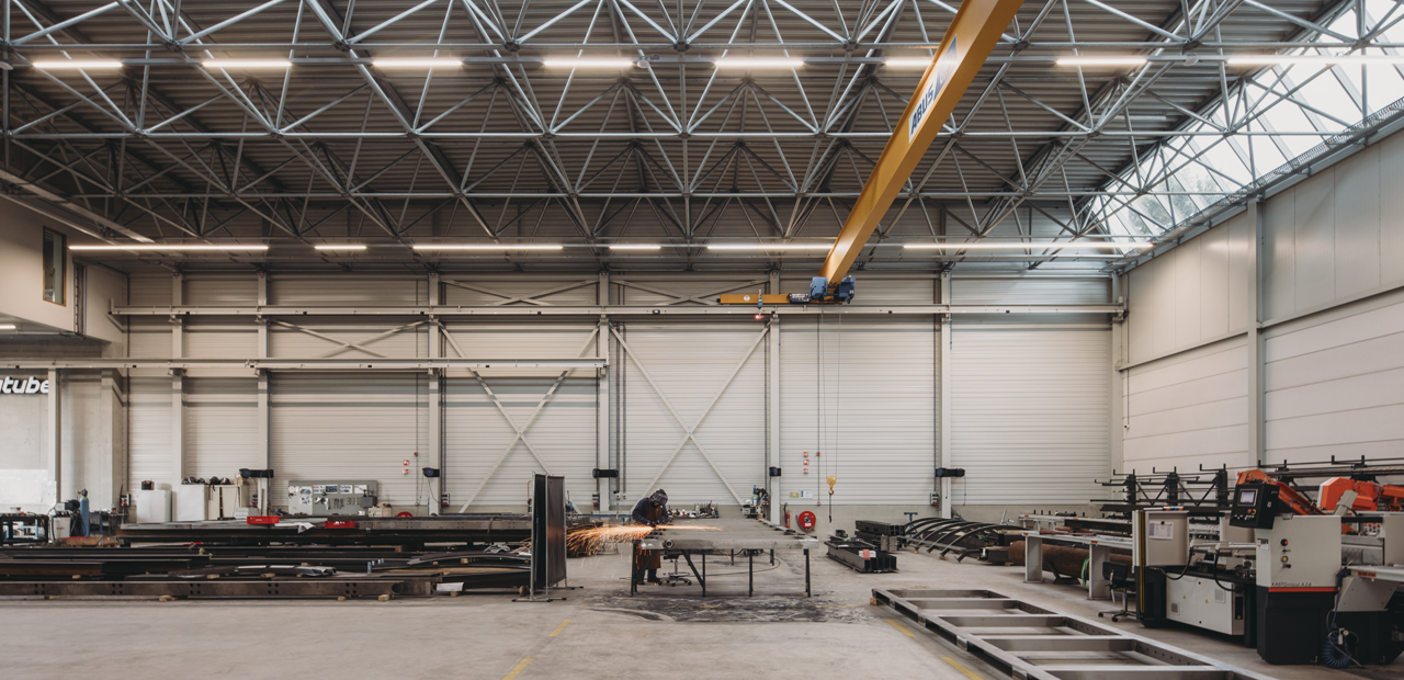 Met onze nieuwe productiehal hebben we nu alle functies op één centrale locatie: productie, assemblage en opslag. De hal heeft een indeling die optimaal aansluit bij onze logistieke processen en scheidt opslag- en werkruimtes. Om alle ruimtes in de hal in de toekomst flexibel te kunnen blijven gebruiken, zijn deze allemaal uitgerust met dezelfde apparatuur, zoals een bovenloopkraan.