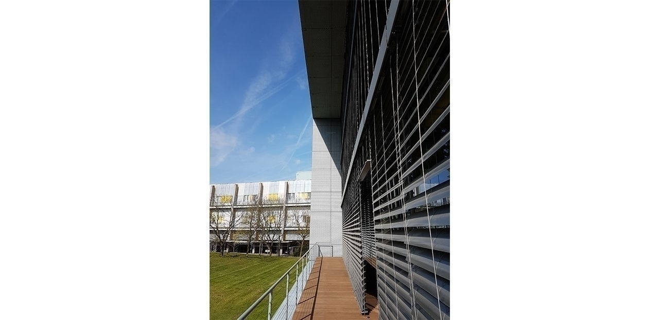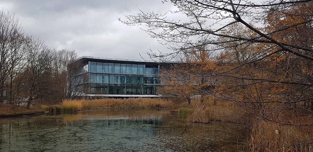 Het gebouw is ontworpen door Ingenhoven Architects en heel stijlvol en gedetailleerd gemaakt. De gevels zijn aan de open, glazen kant georiënteerd op het zuiden en aan deze zijde kan je dan ook genieten van het panoramisch uitzicht. Hier vind je het meer en het houten terrasdek. Het terras is een intensief gebruikte ontmoetingsplek voor de hele campus. Aan de noordzijde zijn de teamkantoren gesitueerd die door middel van de glazen scheidingswanden ook kunnen genieten van het uitzicht.