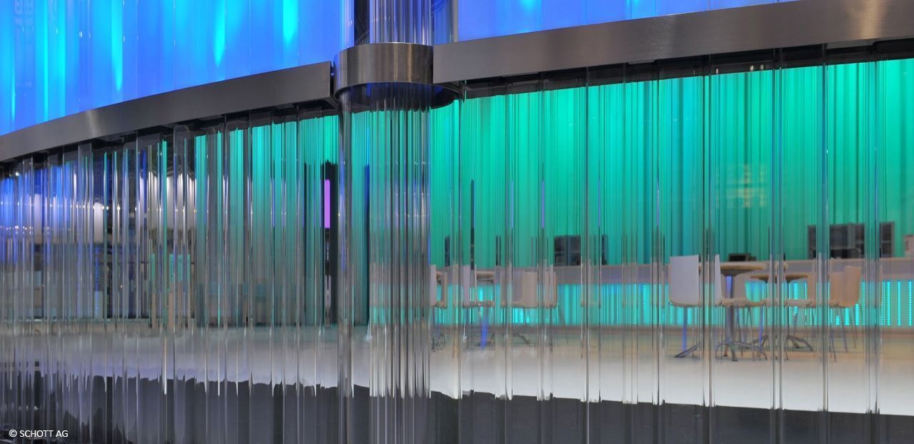 Voor de beursstand van Schott AG op de Glasstec in Düsseldorf heeft Octatube vorige maand een glazen wand gerealiseerd waarin verschillende nieuwe producten van Schott zijn verwerkt, zoals glazen buizen.