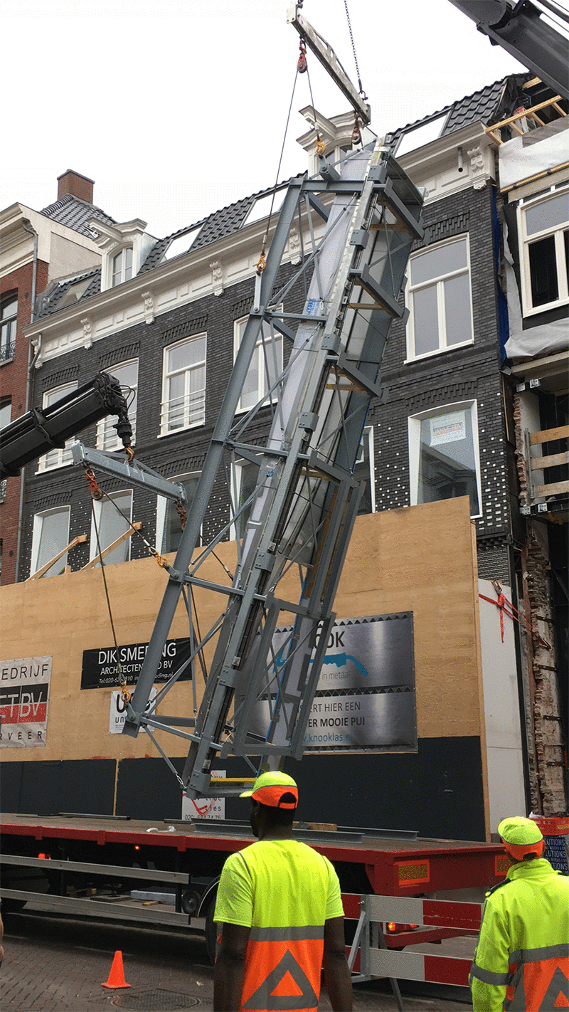 Met uiterste precisie zijn de glazen boxen op locatie in hun definitieve verticale positie gedraaid, met behulp van twee kranen en een ingenieus katrolsysteem. De boxen staan in de gevel in een zogenoemd ‘picture frame’ vant rechthoekige holle stalen profielen. Het glas is met kit aan dit frame bevestigd. Ook de steunen en beugels voor de deuren zijn aan dit frame gekoppeld. Ook hebben we extra verbindingen aangebracht tussen de picture frames om de stijfheid voor de deurverbindingen te versterken. Nadat we de glazen dozen stevig in de gevel hebben bevestigd, hebben we de hulpframes verwijderd.