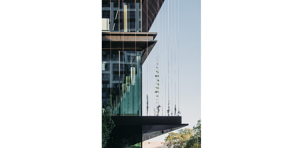 Voor extra zonwering is een dynamische lichtbarriere toegepast: klimplanten groeien langs spankabels tussen de luifels en vormen zo een groene gevel die zonlicht subtiel filtert.