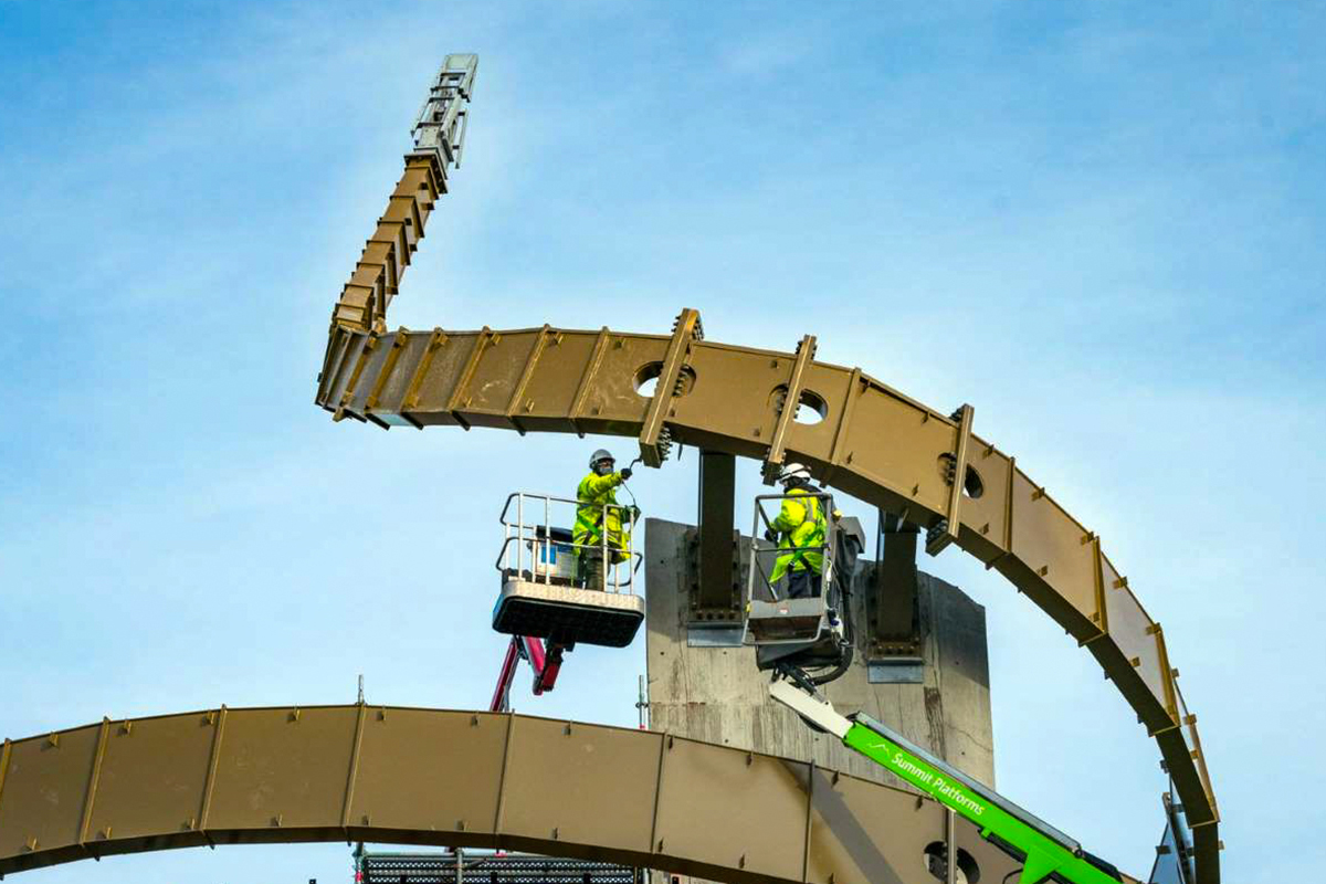 Naast de balustrade heeft Octatube ook de andere onderdelen van het lint gerealiseerd: het zogenaamde lower ribbon - het deel dat vanaf het plein omhoog kronkelt richting het gebouw - en de top flourish - het 17 meter hoge deel op het dak dat de lucht in krult. Deze afzonderlijke structuren gaven ons geheel nieuwe uitdagingen.