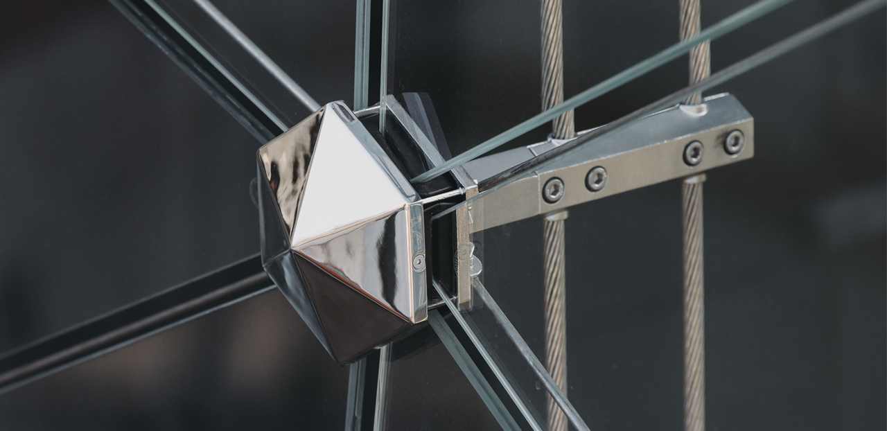 Voor deze gevel hebben we speciaal ontwikkelde elementen van kunststof (pom) laten spuitgieten. Deze elementen hebben we in op maat gemaakte RVS knopen geplaatst. Deze knopen houden de meer dan 800 driehoekige gelamineerde glaspanelen vast in een randomverdeling. De glaspanelen verschillen soms qua afmeting slechts enkele millimeters van elkaar. De knopen zijn met RVS-klemmen aan de kabels bevestigd.