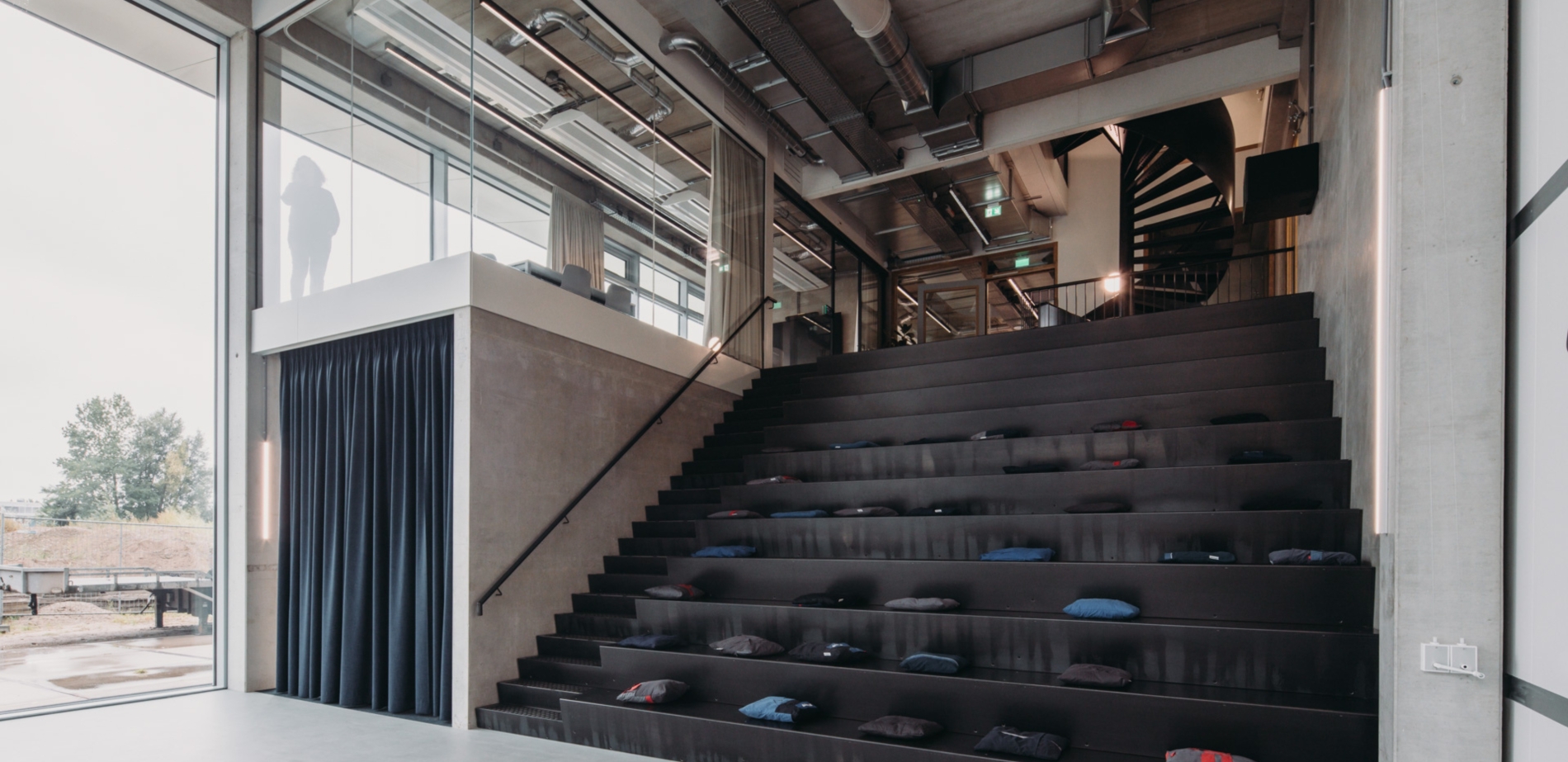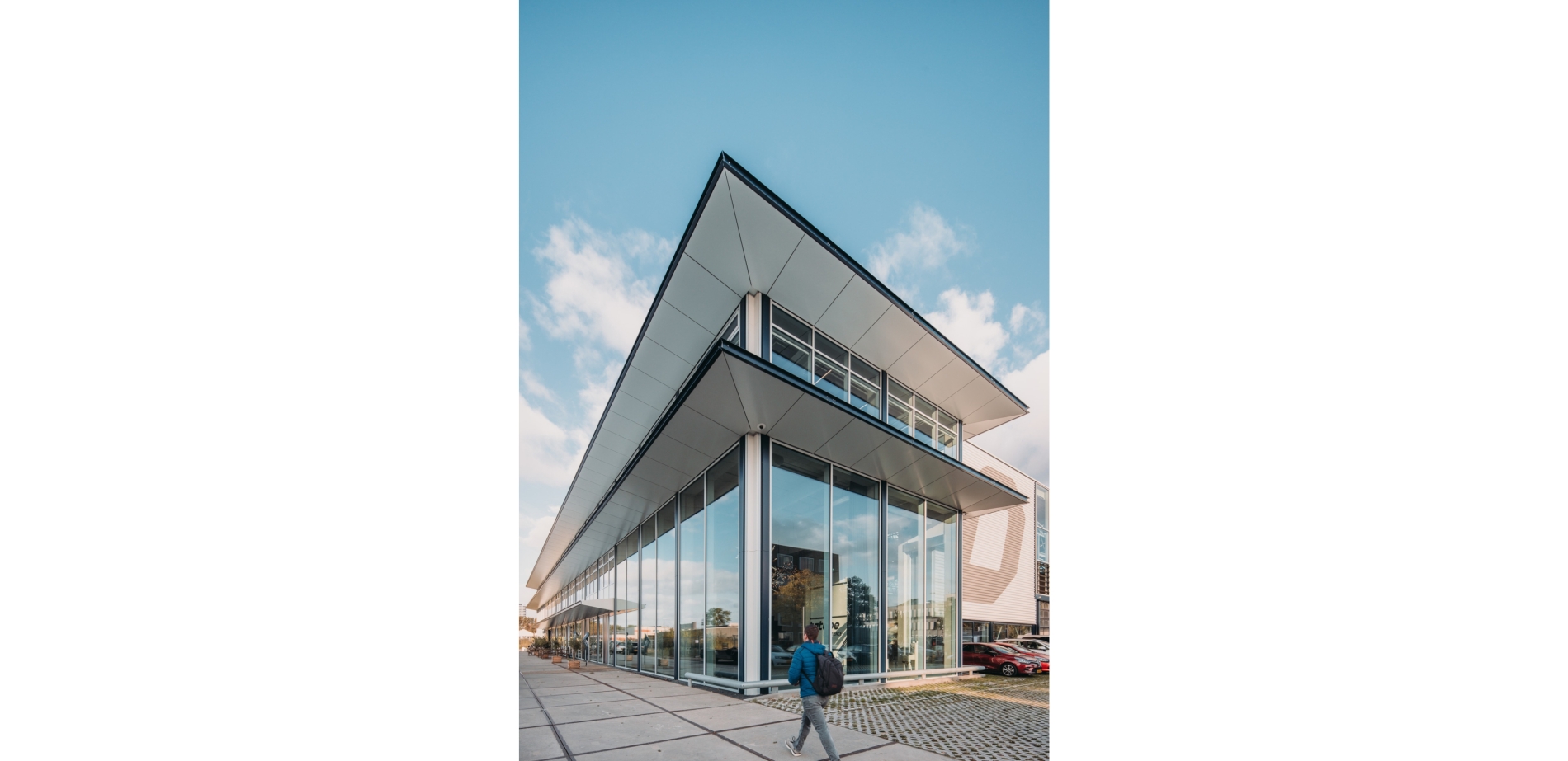 Ons gebouw vormt een open en levendige omgeving die past bij onze bedrijfscultuur. Met een gevel van 7 meter hoge panelen met driedubbel glas en de meest transparante coating zoeken we bewust naar interactie en verbinding met onze omgeving. Je kunt gemakkelijk naar binnen kijken om te zien wat we doen en maken.