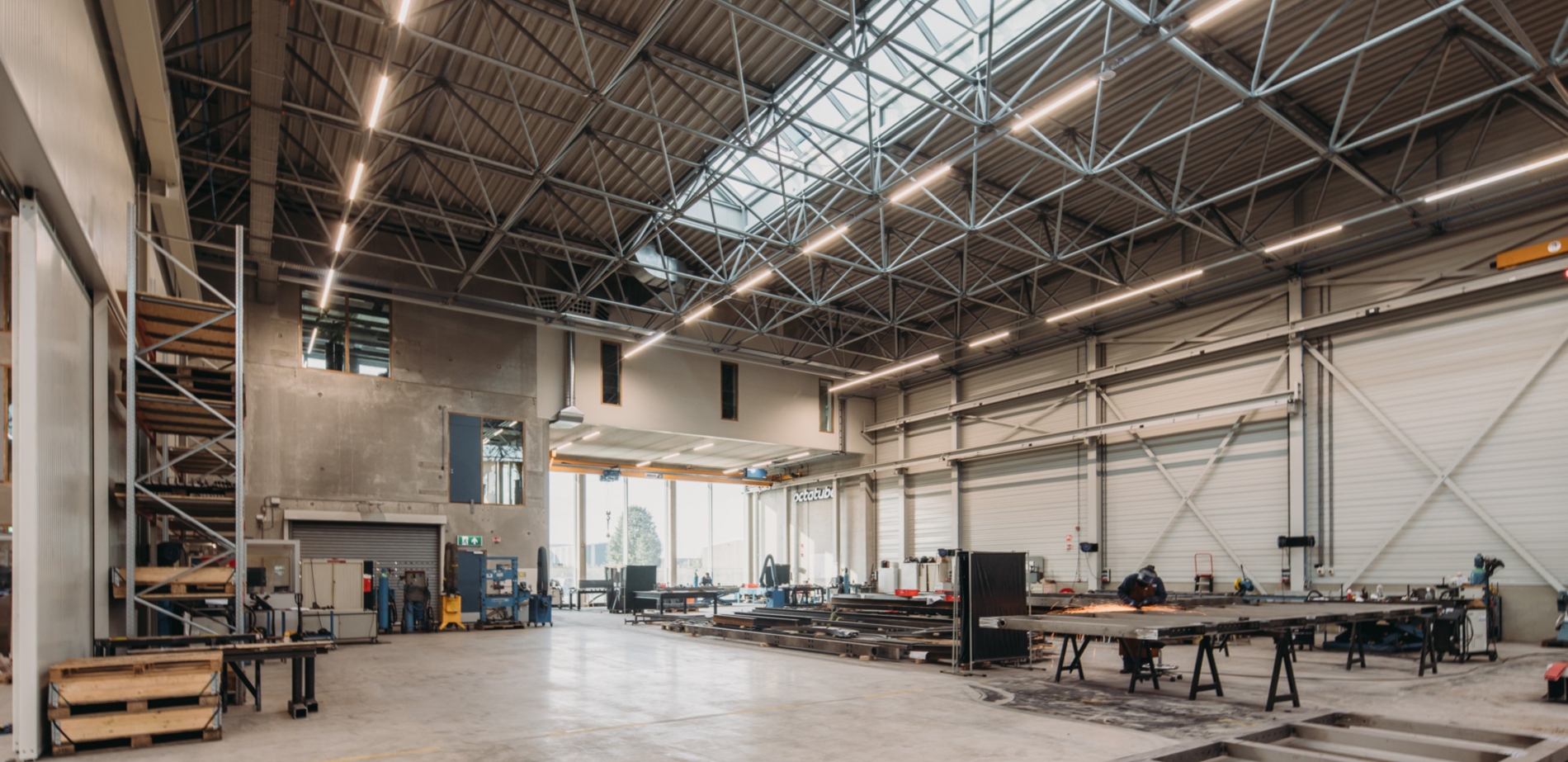 De binnenruimtes van de nieuwbouw zijn flexibel en kunnen vrij worden ingedeeld. Hierdoor kunnen we inspelen op veranderende behoeften. Dit geldt voor het kantoor, maar ook voor de productiehallen waar de binnenruimtes kunnen meebewegen, afhankelijk van de grootte van het project. Het kantoorgebouw heeft nu twee verdiepingen. Structureel (en op het gebied van warmteopwekking) is het klaar voor een derde en vierde verdieping om onze toekomstige groei op te vangen.